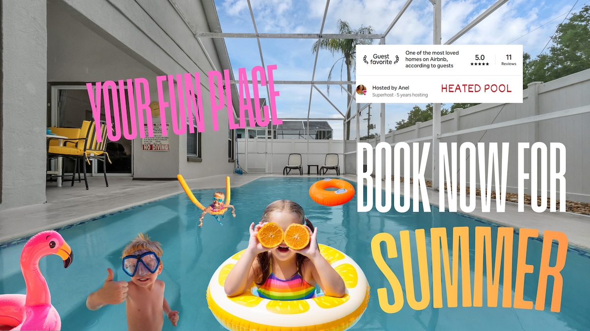 ¡Amplia casa de 4 dormitorios con piscina privada climatizada, a 15 minutos de Disney! Disfruta de una gran piscina orientada al sur, parrilla de propano, televisores inteligentes con Disney+ en todas las habitaciones. Nintendo Switch en el salón y una pantalla de85pulgadas con una PS5 en un garaje /sala de juegos con temperatura controlada. Wifi rápido, tejo, mesa de billar y muchos juegos de mesa. Diversión 🌴 al aire libre Asientos en el patio para 14 + dos tumbonas. Parrilla de propano: $50 por la duración de la estadía Calefacción de la piscina: $ 200 por estadía (aviso de 24 horas)