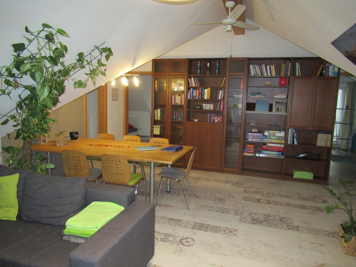 Es handelt sich um eine 80m2 Dachgeschoss Wohnung auf 2 Ebenen (1 Stock: Diele, Garderobe, Einbauschrank, Duschbad/WC, 2. Stock: Loft mit kompletter Küche, Bar, Esstisch, Couch (bzw Schlafcouch), Schreibtisch, Kaminofen, Doppelbett, Badezimmer (WC/Wanne/Waschmaschine) u. Klappbett bei Bedarf. Monoblock Klimabox. Nachbarschaft ruhige Wohnsiedlung direkt am Waldrand. Parken überall immer leicht möglich. S-Bahn 7 min Fußweg oder 1min Bus. 15min Fahrtzeit bis Marienplatz.