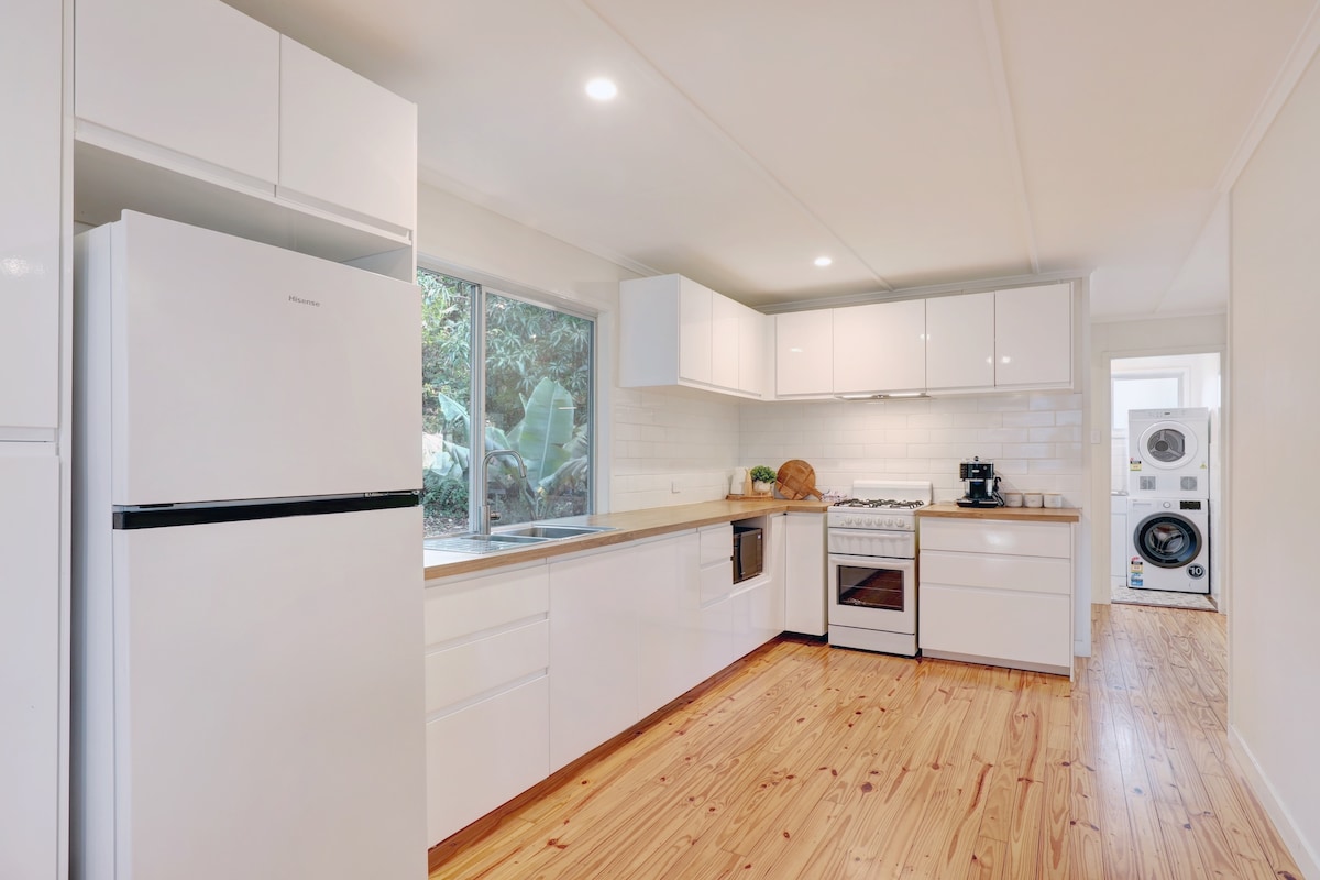 Te encantará esta pequeña casa de playa/dúplex. Está disponible el nivel superior, que es la casa original. (El propietario tiene la unidad de abajo y estará allí a veces). No es grande, pero definitivamente cómoda para cuatro adultos y decorada al estilo de mediados de siglo. Está a 5 minutos a pie del agua y de la tienda General Store. Wifi gratuito y servicios de streaming. Cuenta con 2 cómodas camas tamaño queen. Se permiten hasta 2 perros y el patio está vallado de forma segura. Verás koalas y canguros en las inmediaciones. La cocina está bien equipada.