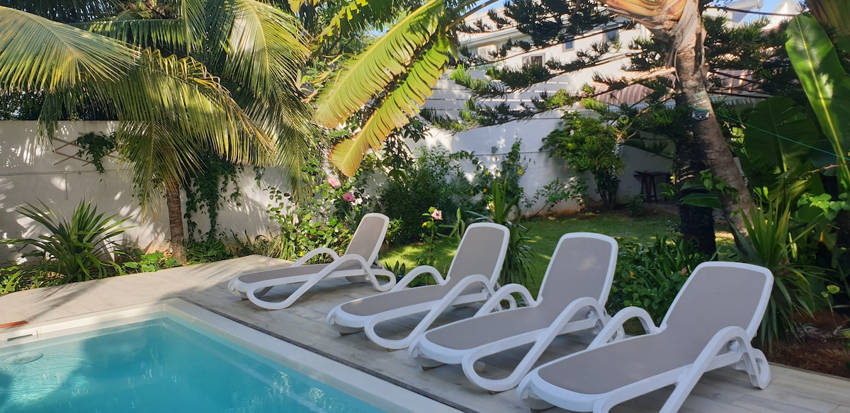 Descubre nuestra villa con elegancia atemporal, perfecta para parejas y entusiastas de la tranquilidad. Ubicado a solo unos minutos en coche de la playa de Trou-aux-Biches, clasificada entre las más hermosas de Mauricio en 2023. Para los amantes del golf, el prestigioso campo de golf Mont Choisy está a 20 minutos en auto y ofrece una experiencia única. Nuestro jardín tropical, que rodea la piscina, crea un entorno idílico para la relajación. Empápate de una experiencia en la que la calma y la naturaleza se armonizan sin problemas.