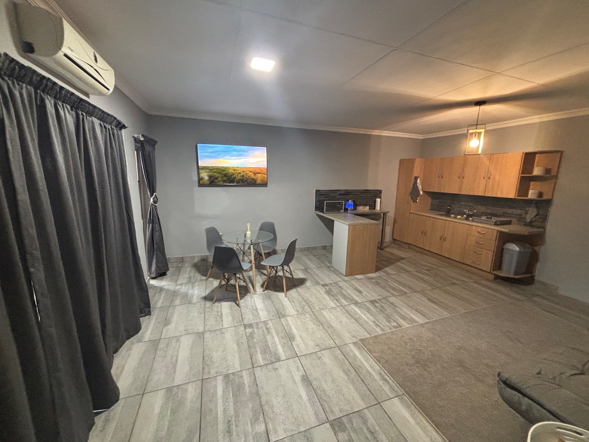 Enjoy a well-appointed one-bedroom unit with a private en-suite bathroom, designed for comfort & convenience. The unit features a fridge, microwave, kettle, utensils, smart TV, dedicated workspace, and unlimited WiFi ideal for both relaxation and productivity. Perfect for business travel, holidays, study, or a peaceful getaway, the unit is located in a quiet area to ensure a restful stay. Daily cleaning services are provided. Free secure parking, outdoor seating area, braai facilities request.