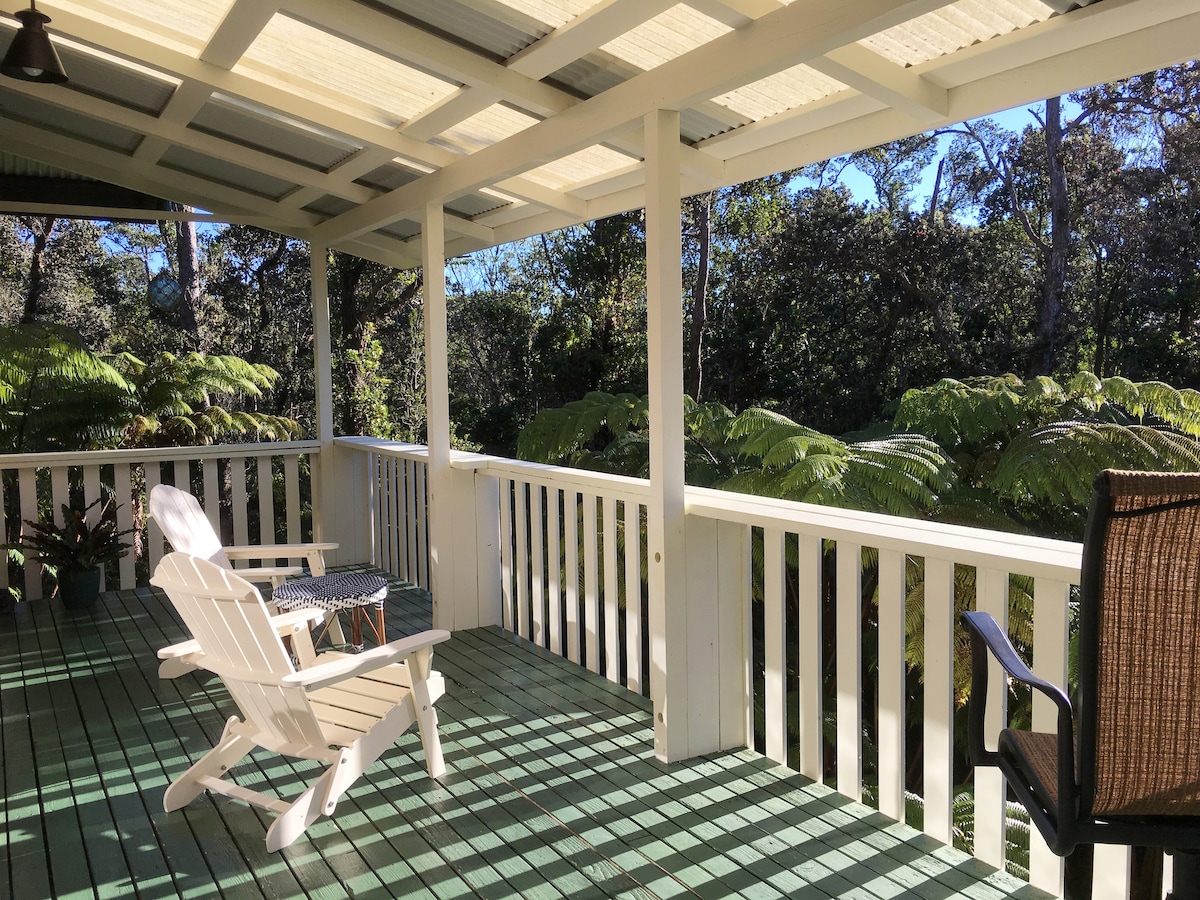 UBICADA en🌴 privado entre imponentes palmeras y vibrante follaje tropical, nuestra tranquila suite está encaramada en un santuario de selva tropical nativa de Ohi'a. EXPLORA playas de arena🌋 negra, selvas salvajes, estanques volcánicos calientes y el Parque Nacional de los Volcanes de Hawái. Disfruta del zen a 🎋 diario con la naturaleza: Cena y relájate en el salón con chimenea en medio de las vistas y los sonidos del bosque en el lanai protegido. REFRESCARSE: la selva tropical💦 prístina ofrece un equilibrio armonizador de sol y lluvia con temperaturas medias de elevación costera más frías de 83H-65L.