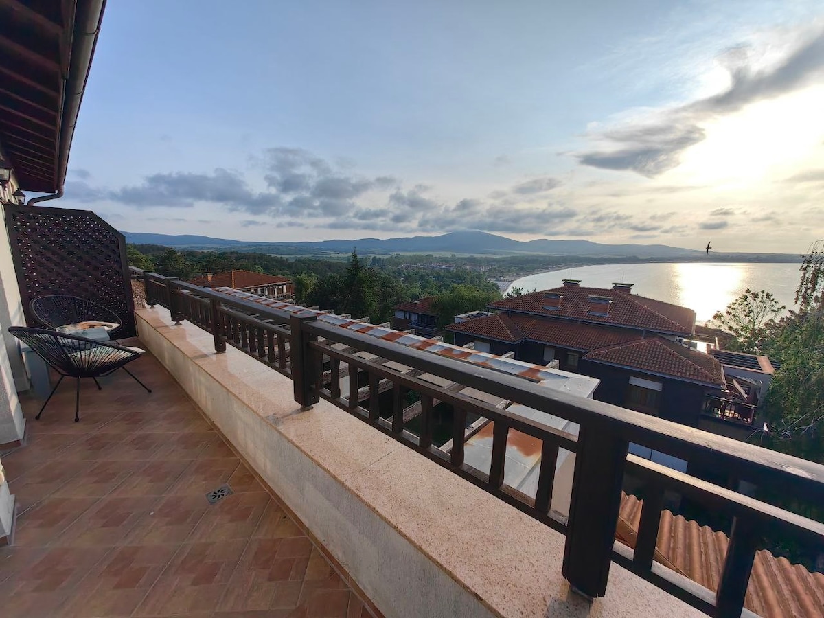 Modern en volledig uitgerust appartement, ideaal gelegen tussen het charmante Nessebar en het bruisende Sunny Beach. Het beschikt over een slaapkamer met 2-persoons bed, slaapbank in de woonkamer, keuken, terras, 2 airco's, tv en strandparasol, twee zwembaden: op 20 en 60 meter, een eigen groote terras en een speeltuin. Supermarkten, restaurants, café liggen op loopafstand. Rustige, groene omgeving met goede verbindingen. Parkeren is gratis. Luchthaventransfer beschikbaar tegen extra betaling.