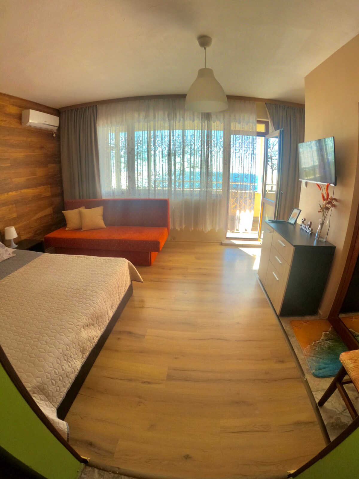 A 8 pasos de la playa es un departamento nuevo y acogedor con impresionantes vistas al mar. ¡Todo está cerca! Estarás en primera línea de la playa con increíble sanación y arena suave, para que puedas escuchar las canciones de las olas. Sanatorio a 2 minutos a pie, Museo de la Sal a 5 minutos a pie, ciudad de Burgas a 10 km , aeropuerto a 7 km. El casco antiguo y el centro, a 10 minutos a pie. El tren turístico se detiene justo delante de ti. ¡Hay muchos restaurantes,tiendas, atracciones, cines de verano y nuevo parque acuático para disfrutar de tus vacaciones!