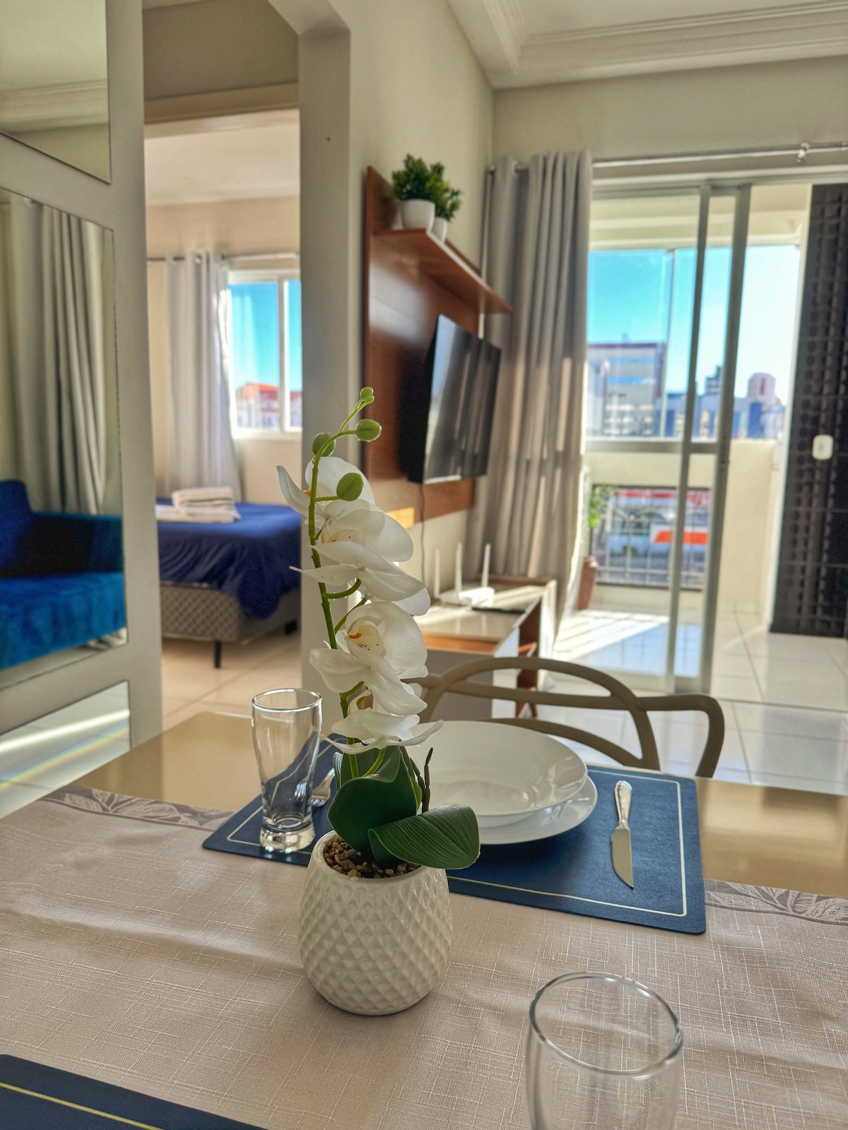 Apartamento moderno con vistas impresionantes, especialmente para la puesta de sol. Excelente ubicación, cerca de farmacias, gimnasio, UPA, panadería y frutería. Estacionamiento incluido. El condominio ofrece un mercado y espacio para mascotas. Priorizamos el reciclaje, con contenedores específicos. Tiene un televisor en la sala de estar y el dormitorio, además de una Nintendo para divertirse. La oficina en casa está bien equipada, con una pantalla adicional, alfombrilla para el mouse y silla para jugadores. Aire acondicionado en la sala de estar (frío) y ventiladores/calefactores en las habitaciones.