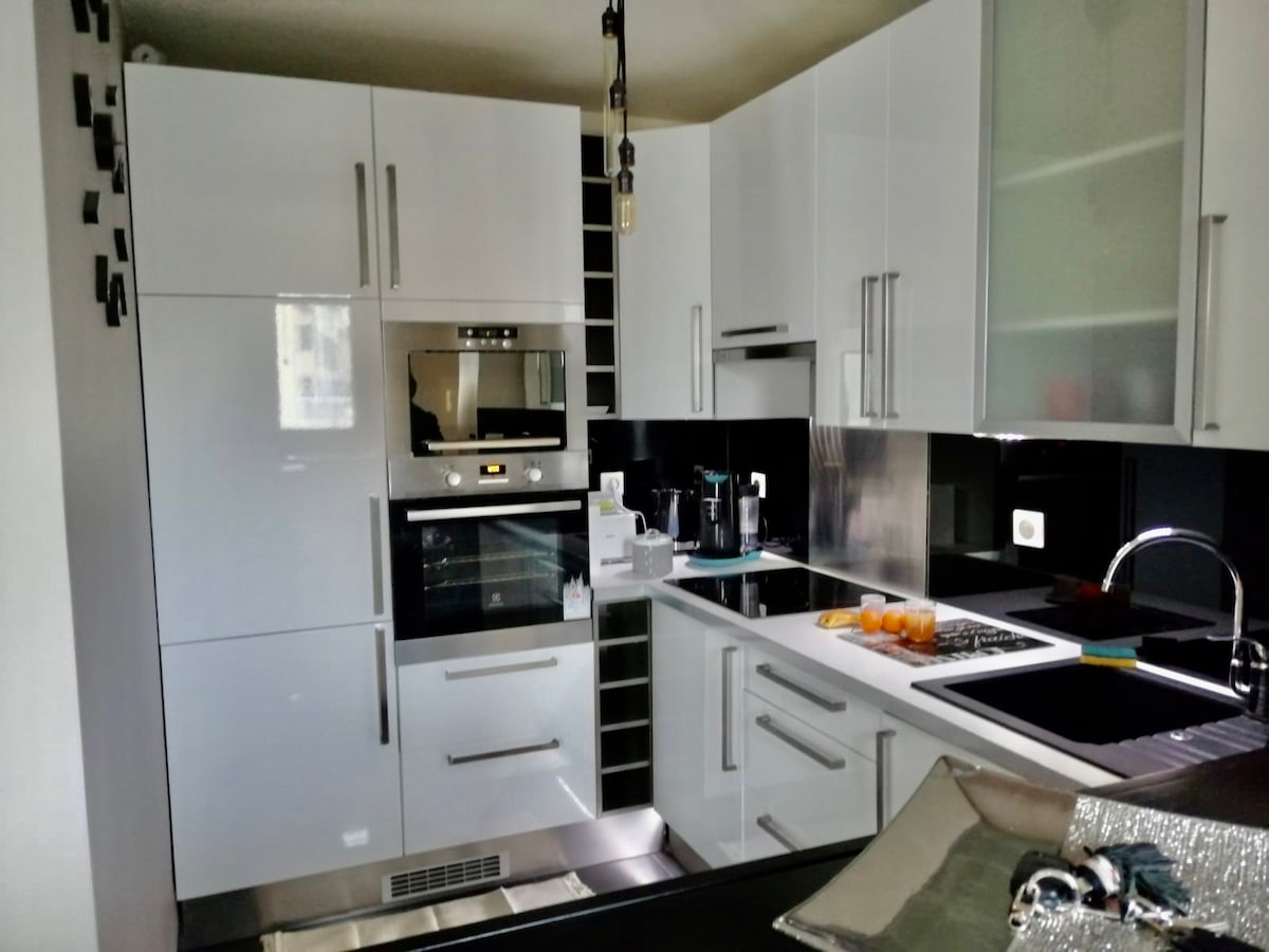 Una decoración de estilo escandinavo depurado . Suministro de un retroproyector y una pantalla grande. El apartamento está en una zona tranquila y silenciosa, con vistas a la antigua plaza de la ciudad con algunas tiendas al pie del edificio (panadería,banco , farmacia , sándwich pizza tienda de comestibles ,floristería ,peluquería, etc.) Centro comercial Carrefour a 1 km, muy cerca. Edificio con televisión vigilancia en la entrada Apertura a distancia