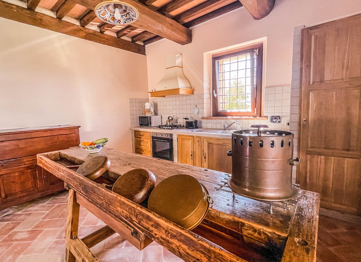 Amazing country house immersed in the vineyard of Cantina Lapone, viewing Orvieto. Recently restored, over 100 sm, organised on two floors. Ground floor is a single space with a big living room (with fireplace) and a spacious open kitchen. First floor with two bedrooms and two bathrooms: the main bedroom (looking at Orvieto) with a double bed and internal bathroom and a second one with a double bed and a bed sofa. Private garden and parking. Private pool (shared with another 4 guests house).