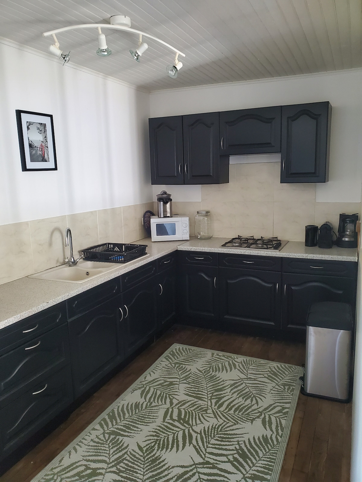 Ce gîte au cœur d'un village, a une pièce principale avec un coin cuisine (plaques induction, four mixte, frigo), un canapé, une table (rabattable) avec 4 chaises, une salle d'eau, et une grande chambre à l'étage, une table utilisable pour travailler ( wifi de bonne qualité), une commode, une penderie. Possibilité de manger dehors, et d’utiliser la piscine.