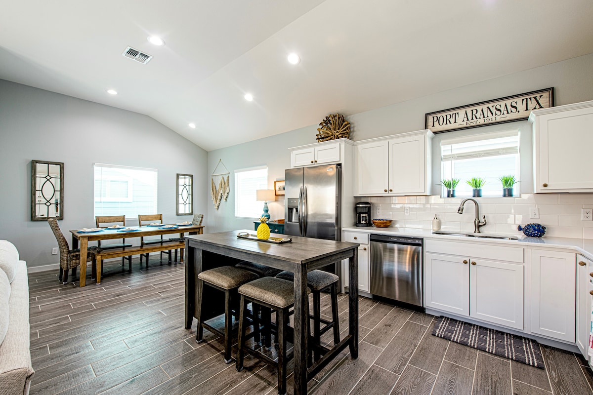 ¡ALOHA OHANA de nueva construcción ofrece una hermosa casa de vacaciones costera! ¡3BR/2BA, piscina privada, cuadras del Port A Beach! Siéntate en la terraza delantera con café por la mañana para tomar el amanecer o disfruta de las tardes y noches en el patio trasero con luces de fiesta y una puesta de sol mientras estás sentado alrededor de la piscina. Cocina bien surtida para cocinar. Lavadora y secadora. King Rm, Queen Rm, Bunk Rm. Zona de carritos de golf. No se permite fumar. Sin mascotas. ¡Las fotos cuentan esta hermosa historia! COPASTR: 270-718