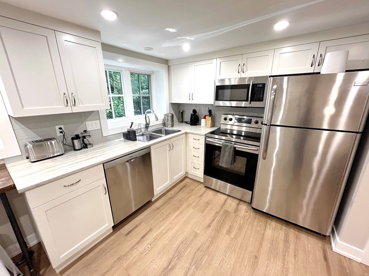 A los huéspedes les encanta nuestro alojamiento, que se encuentra entre el 5 % de los mejores: impecablemente limpio, con un diseño precioso e increíblemente cómodo. Suite de estilo boutique con techos altos, una lujosa cama king y una comodidad superior a la de un hotel. Disfrute de una sala de estar luminosa, lavandería en la suite, wifi de 1 G, TV inteligente de 52 pulgadas con Netflix, café y té gratuitos, entrada privada y estacionamiento gratuito. Calefacción con termostato y frescor natural en verano. A poca distancia a pie de transporte público, parques y senderos; a poca distancia en auto de tiendas. Perfecto para parejas, familias, viajeros solitarios o estancias de negocios.