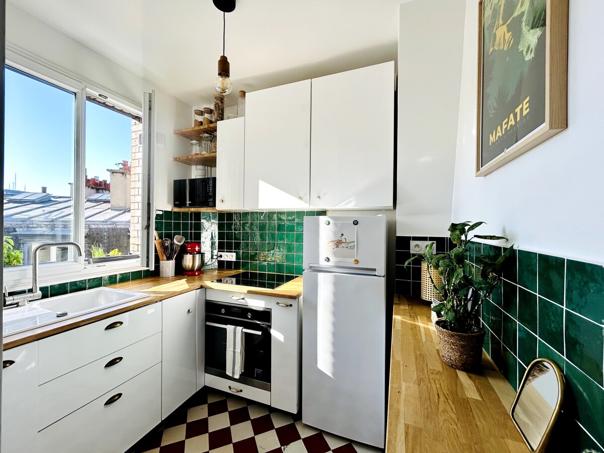 Welcome to this elegant, cozy 42m² / 2 room apartment in the heart of the dynamic 20th arrondissement of Paris. Situated on the 6th floor with a balcony that overlooks a large garden, it’s a calm, bright, contemporary space that has recently been fully renovated to ensure maximum comfort. Close to Pere Lachaise cemetery, it’s a 3 minute walk from the metro, enabling you to be in the center of Paris in just 15 to 20 minutes.