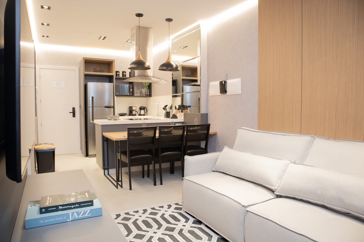 Este lugar único tiene su propio estilo. Piso en el mejor estándar posible Un alojamiento moderno, excelente para alojar a una pareja cómodamente en un piso nuevo. Todo esto en una excelente ubicación en una de las mejores playas de Brasil Cuenta con toda la cocina completa, una cama y un sofá cama para atender a los huéspedes.