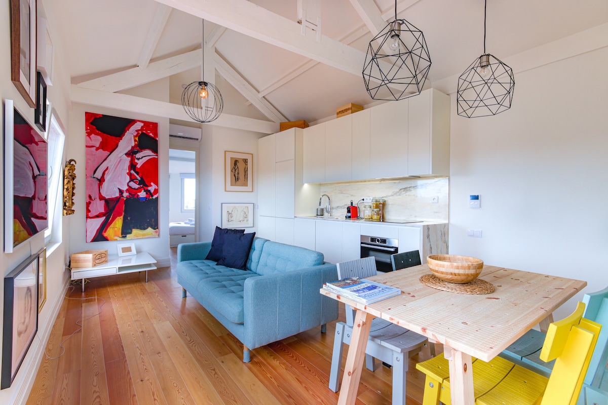 O apartamento (Penthouse) tem um terraço com vista Rio, com jardim vertical. Um quarto com cama de casal de 1,60 x 2,0 metros, roupeiros e cofre. Uma sala com sofá, TV, Netflix, Sistema de som Bluetooth Rotel. Bar com bebidas gràtis. Cozinha equipada com: Microondas, Frigorífico, Máquina de Lavar Louça, Maquina de lavar e Secar Roupa, Placa de Indução, Torradeira, Chaleira e Nexpresso. Casa de banho completa com bidé e duche, secador de cabelo e amenities (gel de banho, champô e creme corporal).