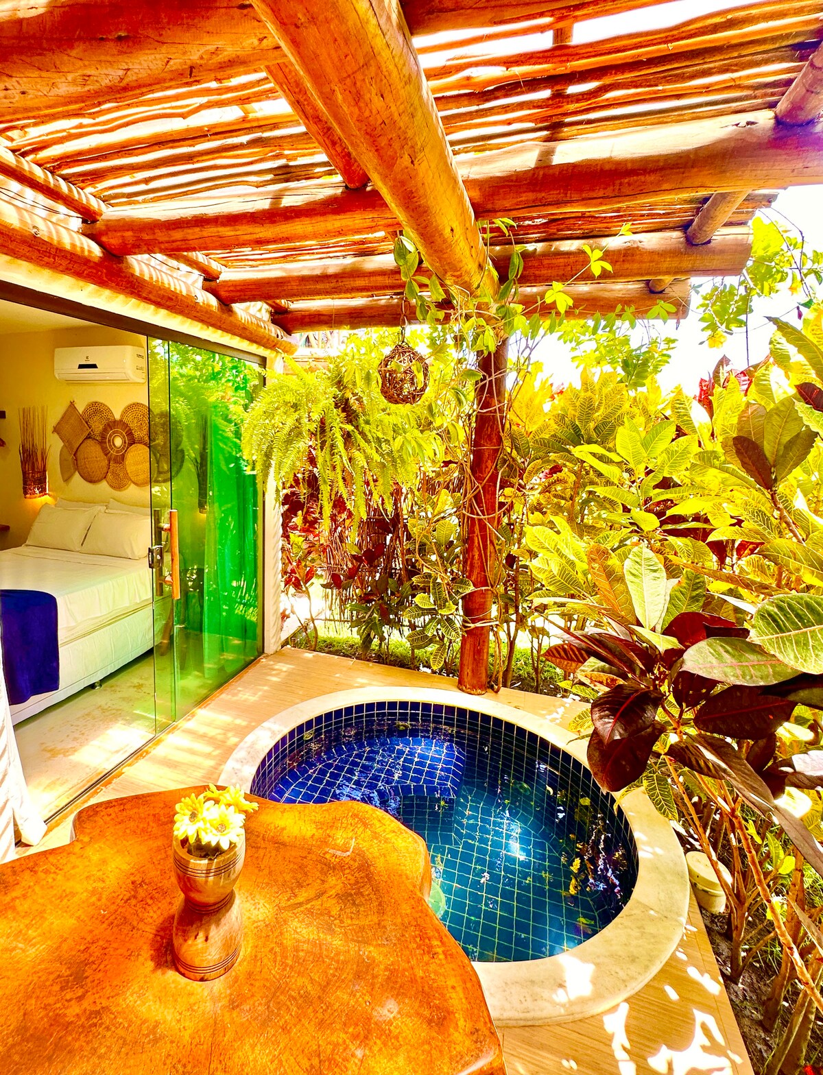 El alojamiento Master Oxente está inspirado en el noreste de Brasil. Su decoración rústica, en medio de una naturaleza exuberante, es una invitación a la relajación. Dispone de jacuzzi privado (hidromasaje) en el balcón con acceso directo al dormitorio de matrimonio. Además cuenta con un dormitorio individual (3 camas), salón y cocina integrada (equipada), aire acondicionado, smart TV con acceso a varios canales, wi-fi (200mb), ropa de cama y baño y acceso exclusivo al jardín. .