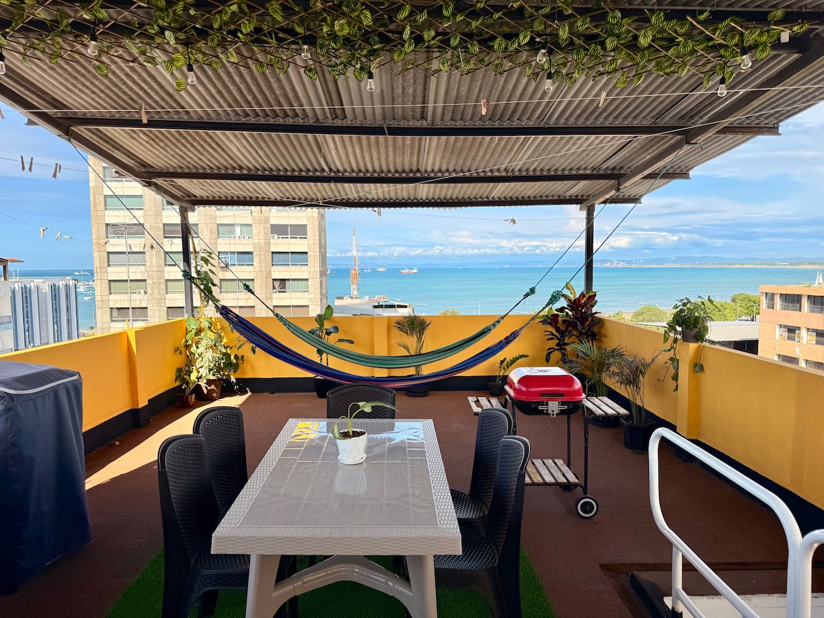 Disfruta de una escapada inolvidable con vista al mar. Este encantador apartamento central está ubicado en la zona bancaria, rodeado de servicios y comodidades. Sumérgete en la espectacular vista al mar que se extiende atraves de la ventana. En las inmediaciones, encontrarás el Mercado central, parque de la madre, plaza cívica, el espigon, malecón. EL PARQUEADERO ES DE PAGO, SE ENCUENTRA A 100 METROS DEL ALOJAMIENTO, DISPONIBLE DESDE 18:00 pm a 8:00am.