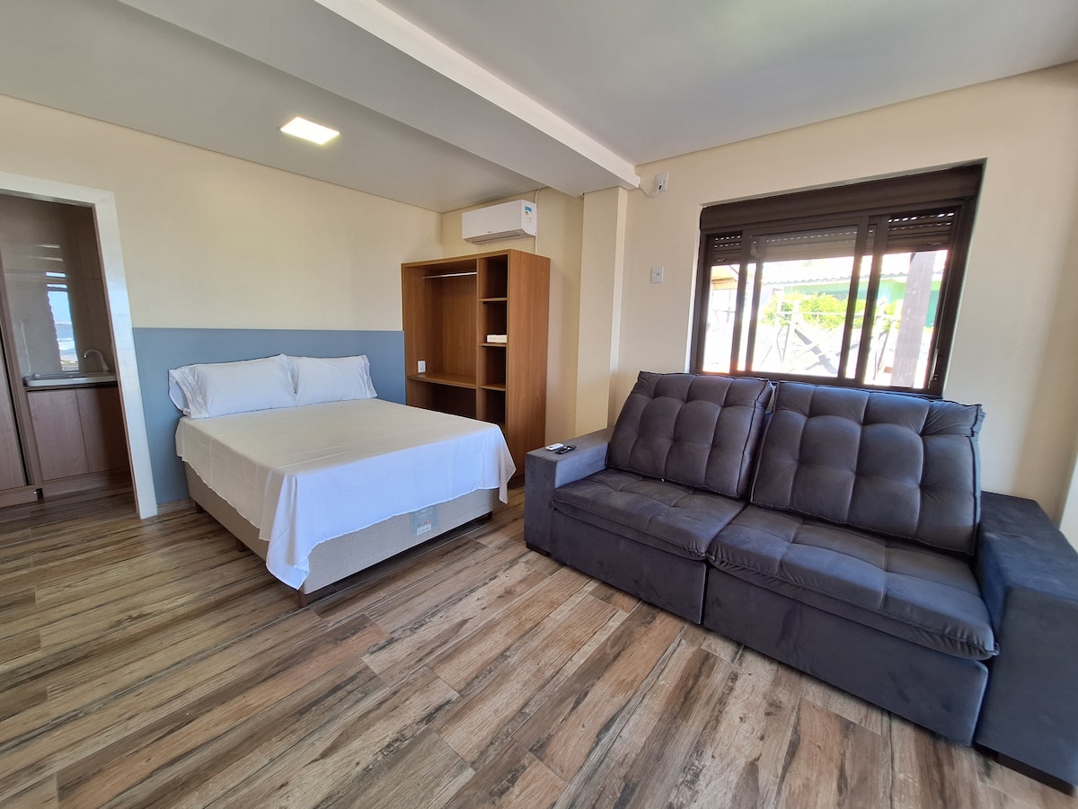 Loft mobiliado, a 300m do mar com vista para o nascer do sol, o Farol e o mar da Prainha. Com capacidade para 3 pessoas, aceitamos um pet🐾 *Possue Deck com vista para o Farol e o Mar *1 Cama de casal *1 Sofá cama * Não disponibilizamos roupa de cama/ manta e toalhas de banho. *Smart TV *Wi-Fi *Estacionamento *Piscina Térmica *Sauna *Academia *Sala de Jogos *Churrasqueira *Aquecedor *Cozinha completa