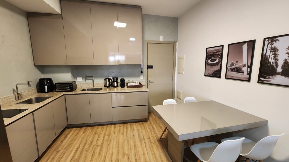 Con 70 m2 , para aquellos que buscan privacidad e independencia . En Savassi, a dos cuadras de Praça da Liberdade y Shopping Pátio Savassi. Con una suite, baño social reversible, sofá cama para los huéspedes, ventana de la suite antirruido, habitación con aire acondicionado y habitación, wifi 300 megas, smartv de 75 pulgadas, Hometheater, cocina completa, microondas, servicio de habitaciones, camarera, valet, piscina , gimnasio, sauna, restaurante y conserje las 24 horas.