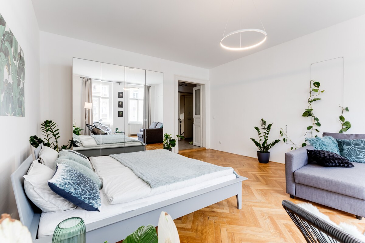 This charming, tastefully renovated three-room apartment (kitchen/diner, sitting room, and bedroom) is in an Art Nouveau building in Vinohrady (Vineyards), one of Prague’s finest and most prestigious neighbourhoods. Unfortunately, the property isn’t suitable for infants or children under 15. If a child is over 15, they’re a fully paid guest, allowing only one extra adult guest.