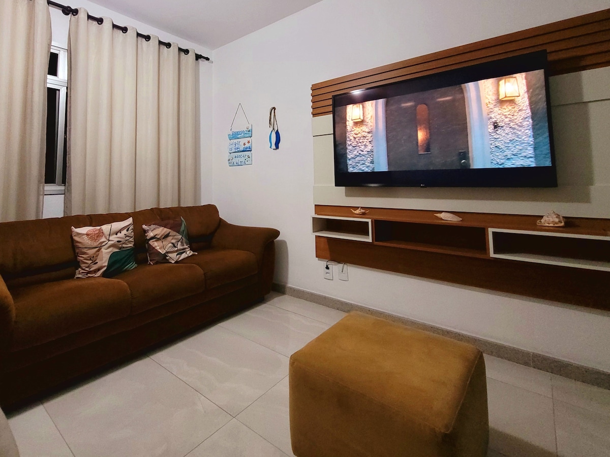 Loft de 02 dormitorios, con toda la estructura de hotel, piscina, salón de fiestas, barbacoa, dormitorios con aire acondicionado, cocina con estufa, nevera, cafetera, filtro de agua, dormitorio con cama Queen y el otro con cama individual. Wifi privado de 360 megas Sala con TV, sofá y todas las comodidades que te mereces. En el centro de Guarapari. Al lado hay panadería, restaurantes, a pocos pasos de la playa.