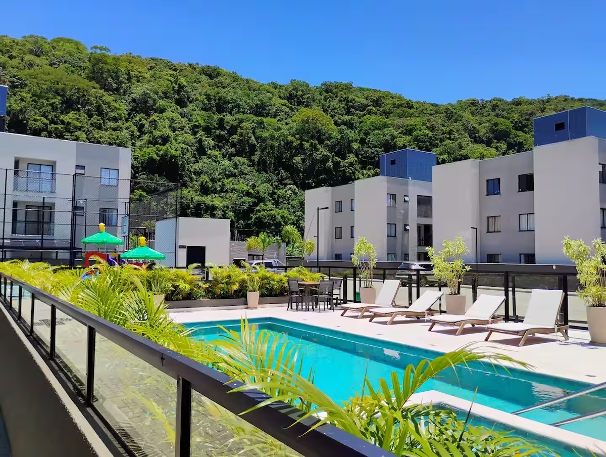 Relájese con toda la familia en este alojamiento tranquilo en un home club con piscina, cancha deportiva, gimnasio, sala de juegos, parque infantil, espacio gourmet, salón de fiestas. Conserjería y entrada al bloque electrónica con reconocimiento facial. Cerca de la playa Mansa y con una vista desde el balcón y la ventana del dormitorio a una colina con bosque atlántico.