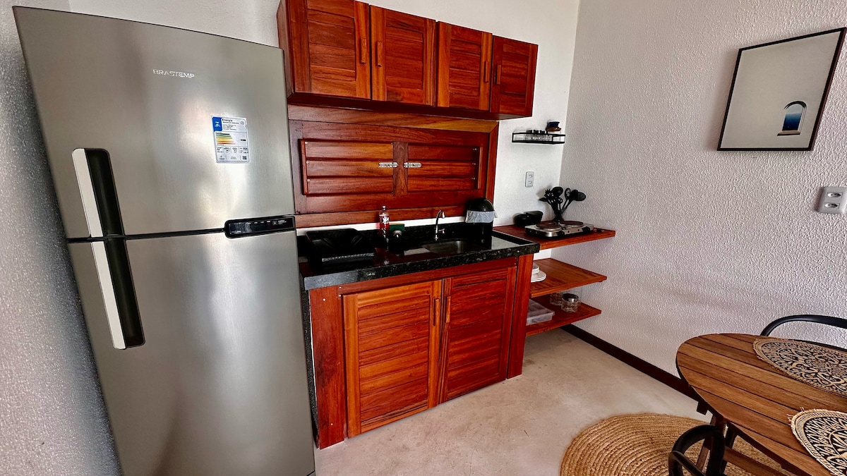 Vista para o mar, jardim e piscina, a terrasse do apartamento deixa um espaço com cadeira e mesinha de salao, aproveitando da brisa do mar. Equipada de uma cozinha americana, os hospedes pode aproveitar a vontade dos eletrodomesticos(toster,liquificador,micro ondes, cafeitera) e outras ustensiles de cozinha. Dois quartos com cama de casal e ar condicionado + um colchão de solteiro. Idéal e confortavel para 5 pessoas.