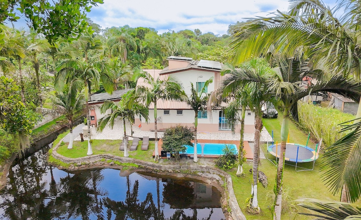 Has encontrado la granja perfecta para una experiencia familiar inolvidable en Pontal do Paraná, a 2 km de la playa de Shangrila. A los niños simplemente les encantará, hay una piscina con jacuzzi, un lago privado, una barbacoa con vistas al lago, una zona de ocio con un trampolín y una mesa de ping pong. Vista de las montañas de la Serra do Mar y del bosque atlántico nativo. Con una casa de 4 dormitorios, tiene capacidad para hasta 12 personas. Suite y un dormitorio más con aire acondicionado. Vacaciones para 4 autos.