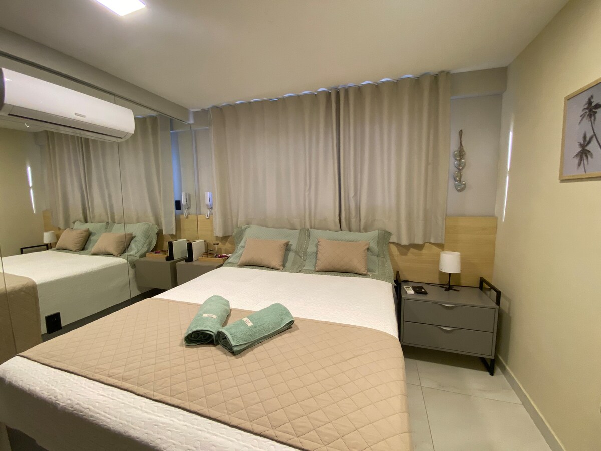 - Piso plano en la arena con increíbles vistas al mar de Bessa, una de las playas más hermosas de João Pessoa. - Capacidad para 3 personas + 1 niño gratis - Cama tamaño queen, sofá cama. - Aire acondicionado, cortina opaca, sábanas y baño de hospitalidad. - Cocina completa (nevera, estufa, microondas, cafetera y filtro de agua). - Wifi. - TV inteligente de 60pulgadas. - Azotea con piscina, barbacoa y vistas. - Gimnasio de entrenamiento - lavandería - Recepción las 24 horas. - Cerca de bares y restaurantes - Aparcamiento giratorio gratuito.