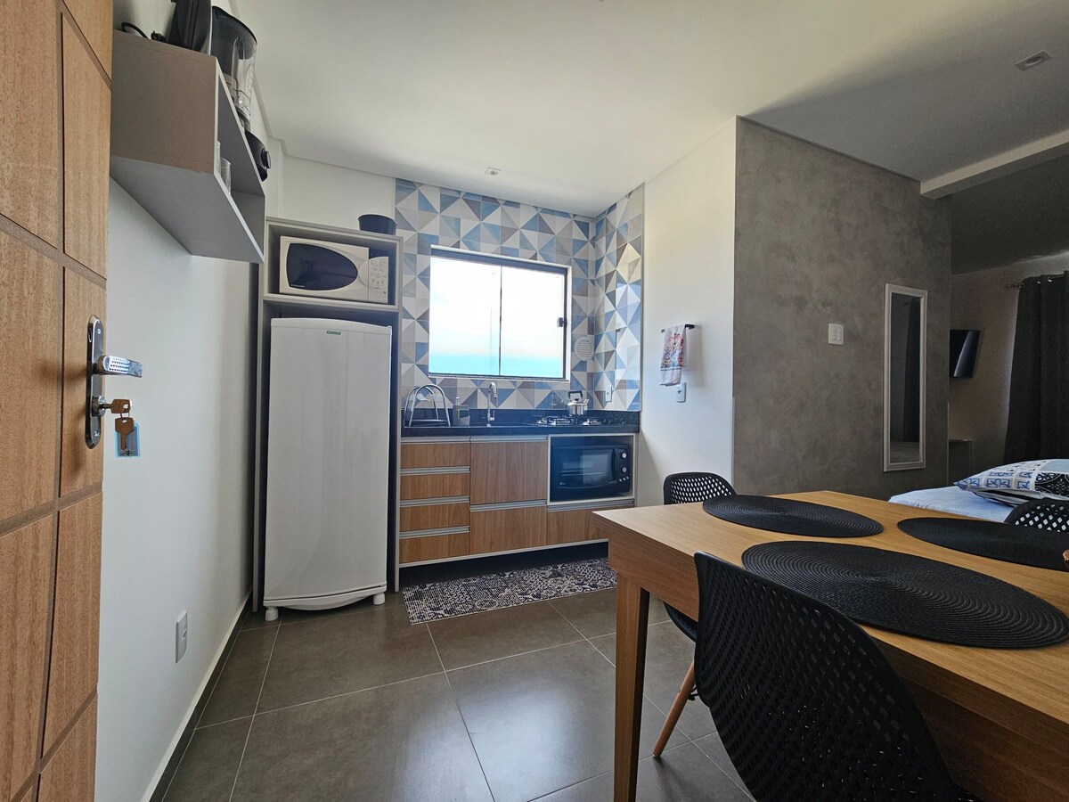¡Departamento nuevo, encantador y acogedor! ¡A solo 3 minutos de la playa y en la región más céntrica, en la calle 238! Equipado con todo para tu comodidad, como sábanas de cama y baño, fundas, almohadas, aire acondicionado e Internet. Tiene capacidad para un máximo de 4 huéspedes, en una acogedora cama doble y otro sofá cama. Tiene una cocina nueva y completa, refrigerador, estufa, cafetera y todos los utensilios básicos para una gran experiencia de estancia. Lavadora y secadora. Baño, agua caliente.