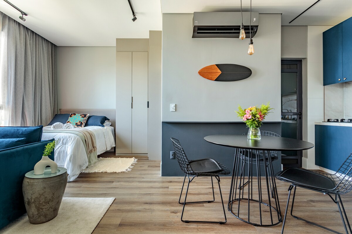 ¡NO SE ADMITEN MASCOTAS! Estudio moderno y decorado, con oficina en casa, aire acondicionado, cocina completa, lavadora y secadora, y acceso a una increíble piscina infinita en el condominio. Con capacidad para 2 personas, el espacio integrado ofrece el equilibrio perfecto entre comodidad y privacidad. Equipado con aire acondicionado, que ofrece noches tranquilas y días más agradables. Totalmente funcional, cuenta con todos los utensilios y electrodomésticos.