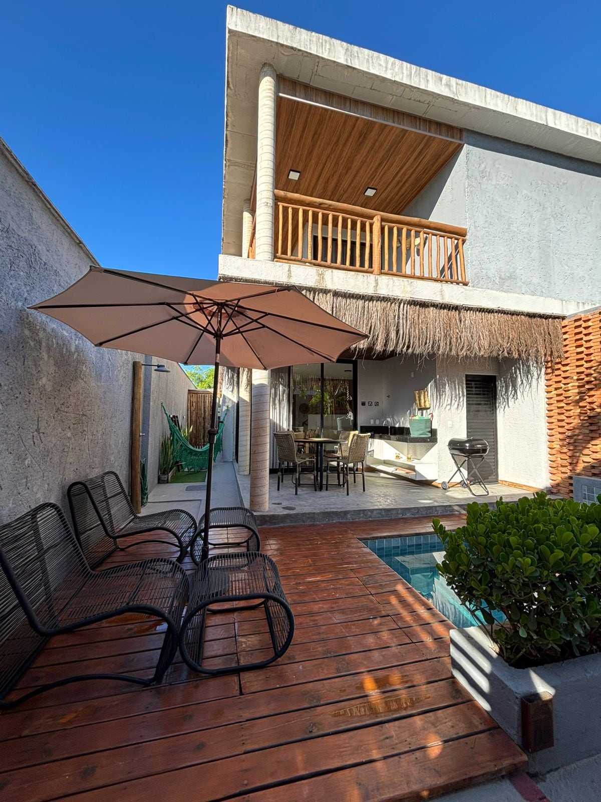 • Prime Location: Close to the beach and the Chapel of Milagres. • Exclusive Highlights: Private rooftop pool and barbecue area. • Complete Accommodations: 3 en-suite bedrooms with air conditioning. • Indoor Spaces: Comfortable living room and fully equipped kitchen. • Internet: High-speed Wi-Fi. • Outdoor Spaces: Spacious terrace with a hammock and views of the coconut groves, perfect for relaxing. • Security: Private Condominium with 24-hour security.