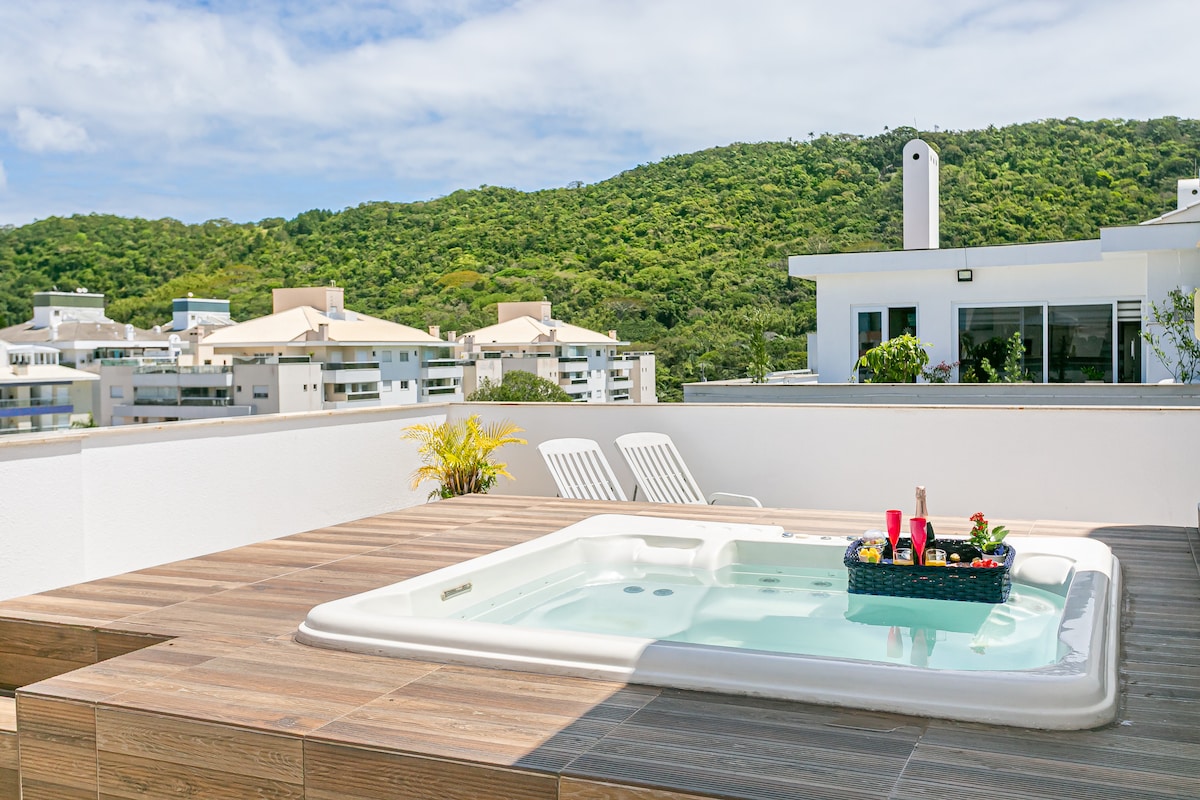 ÁTICO EXCLUSIVO con JACUZZI CLIMATIZADO en su gran ÁREA EXTERIOR PRIVADA, iluminación nocturna especial y VISTA SIN OBSTRUCCIONES. Ubicado arriba de los edificios vecinos, garantiza total privacidad y una vista impresionante de las dunas y Praia do Santinho. El condominio está frente a Praia dos Ingleses, ¡solo tienes que cruzar la calle! También aprovecha la piscina infinita del condominio con vistas al mar.