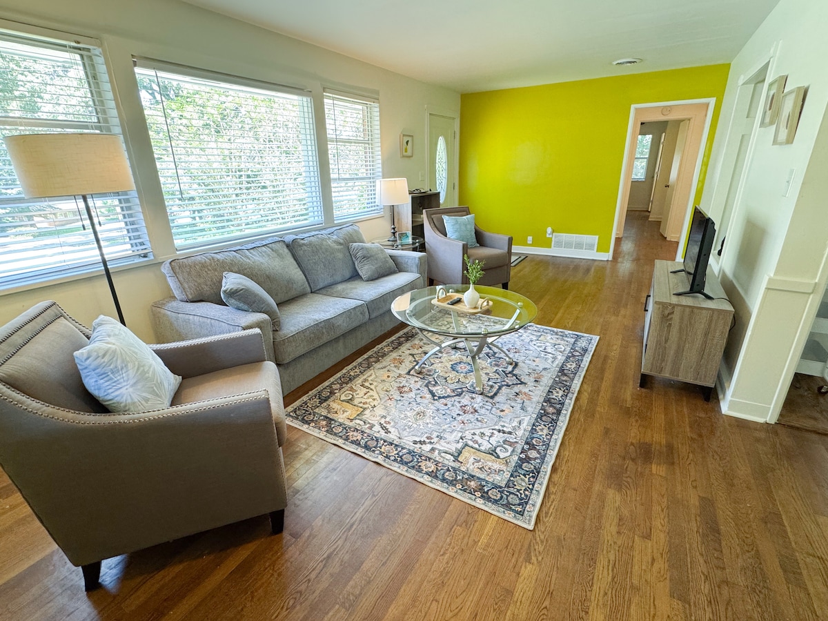 ¿Buscas el retiro perfecto o una escapada de fin de semana? ¡Te tenemos cubierto! La casa cuenta con un gran porche delantero cubierto. El salón tiene un sofá cama de gran tamaño con una cama nido extraíble para dos personas. ¡La casa está decorada con arte único en su tipo! ¡Sin mencionar que estarás en la misma calle que no una, sino dos de las casas que aparecen en HGTV Hometown Takeover! Si quieres explorar el centro de la ciudad, está a poca distancia a pie o a 3 minutos en coche del puente del centro.