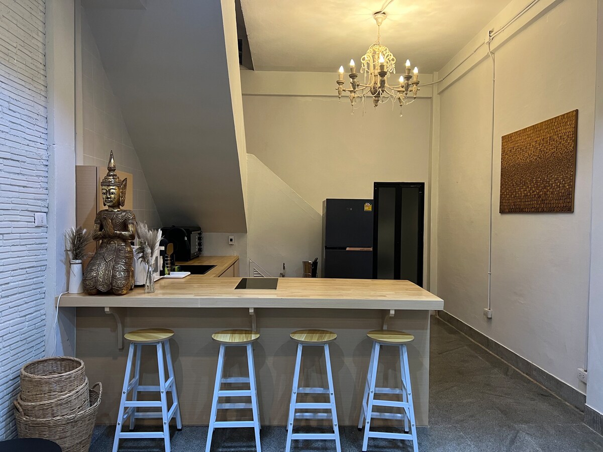 Da la bienvenida a los huéspedes a HaunHaus 01, un acogedor apartamento con ambiente de BauHaus. Distancias A pie: 🛒 A 3 minutos de Nana Plaza. 🏞️ A 5 minutos del parque forestal Benchakitti. A 🚆 7 minutos de Nana BTS y Sukhumvit 11 restaurantes/vida nocturna 🏥 Fácil acceso al Hospital Bumrungrad y QSNCC Servicios: 💪🏻 Piscina y gimnasio Wifi 🛜 de alta velocidad Sábanas 🛏️ cómodas Proyector 📽️ inteligente TV 📺 inteligente Altavoz con bluetooth🔈 Marshall 👮Conserje y seguridad las 24 horas, 7 días a la Limpiado y desinfectado después de cada estancia.