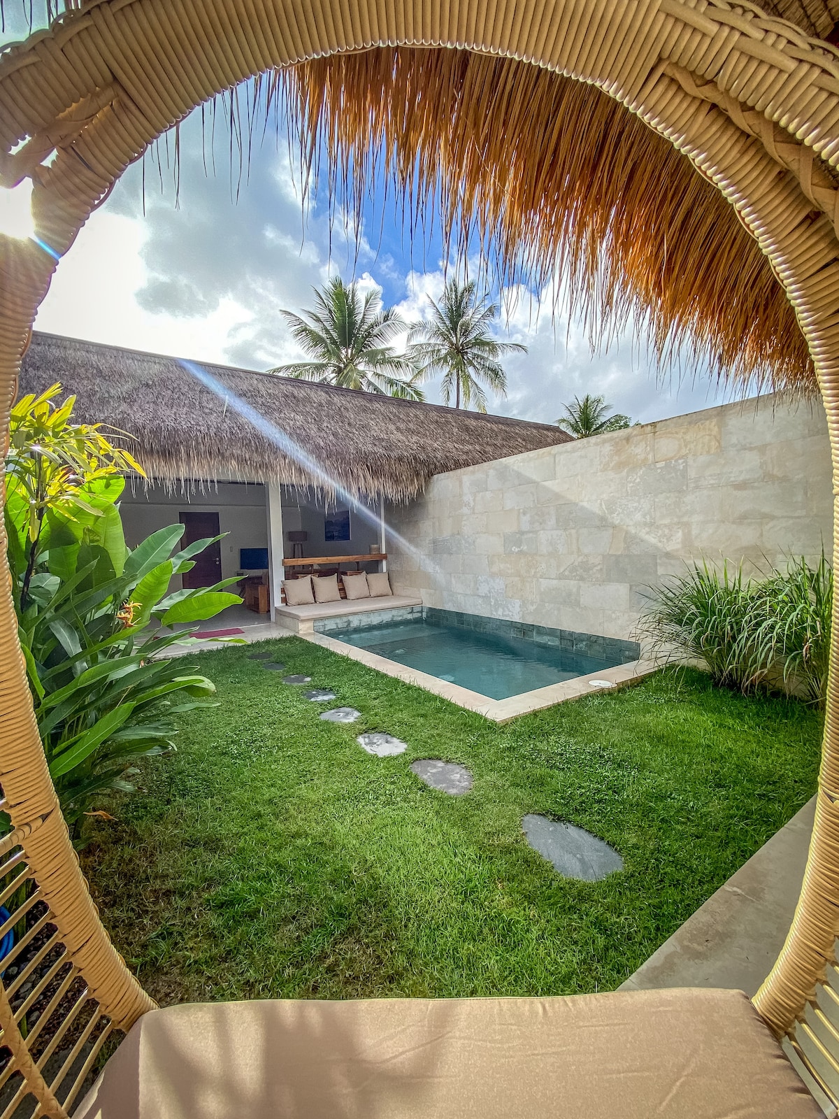ISI ISI is a cosy two floor house with AC, Pool, kitchen, big bathroom and lush garden, built with natural materials and surrounded by palm trees beside a little river. ISI ISI is for those, who like to get in touch with nature and local life. The area is a rural village called Merendeng, 15 minutes away from the main road walkway, 5 minutes with scooter. There is a private parking. The sleeping room provides a panorama view. The big terrace is nice to chill, make yoga or lay in the hammock.