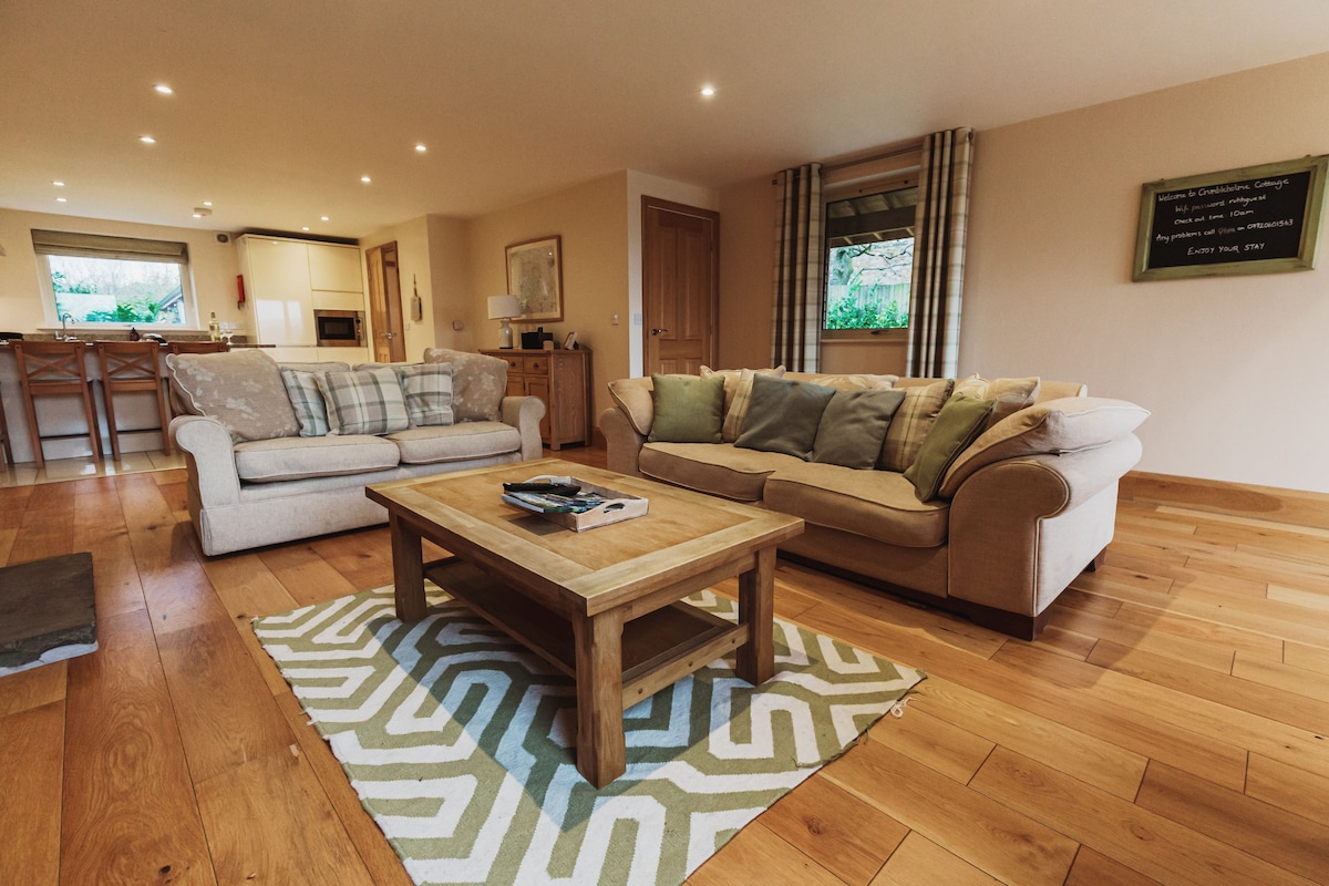 The ground floor accommodation is extremely stylishly appointed with a large, open-plan living/dining room which features Jacobean-style painted wall panelling as a stunning backdrop. Stone mullion windows, beamed ceilings, oak floors and doors lend a sense of rustic charm to the fabric of the building and yet there is every modern amenity. There is access to wooded and landscaped gardens with long-reaching views of the surrounding countryside and a private area to sit and enjoy the location.