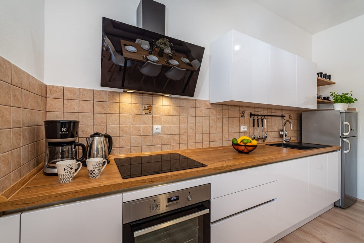 Descubre el lujoso departamento «CAPE» en Rtina. Este departamento de diseño de dos dormitorios en la planta baja ofrece privacidad, un patio espacioso y un jacuzzi privado. Una ubicación excelente, a solo unos minutos en coche del puente de Pašman, que combina la tranquilidad de la naturaleza con la proximidad de Zadar (30 minutos). Es una opción ideal para familias que buscan una comodidad de primer nivel. Te cautivarán las impresionantes vistas panorámicas del mar y de las islas cercanas. Sin embargo, la verdadera estrella del espectáculo es la magnífica puesta de sol, que puedes disfrutar directamente desde el cálido jacuzzi.