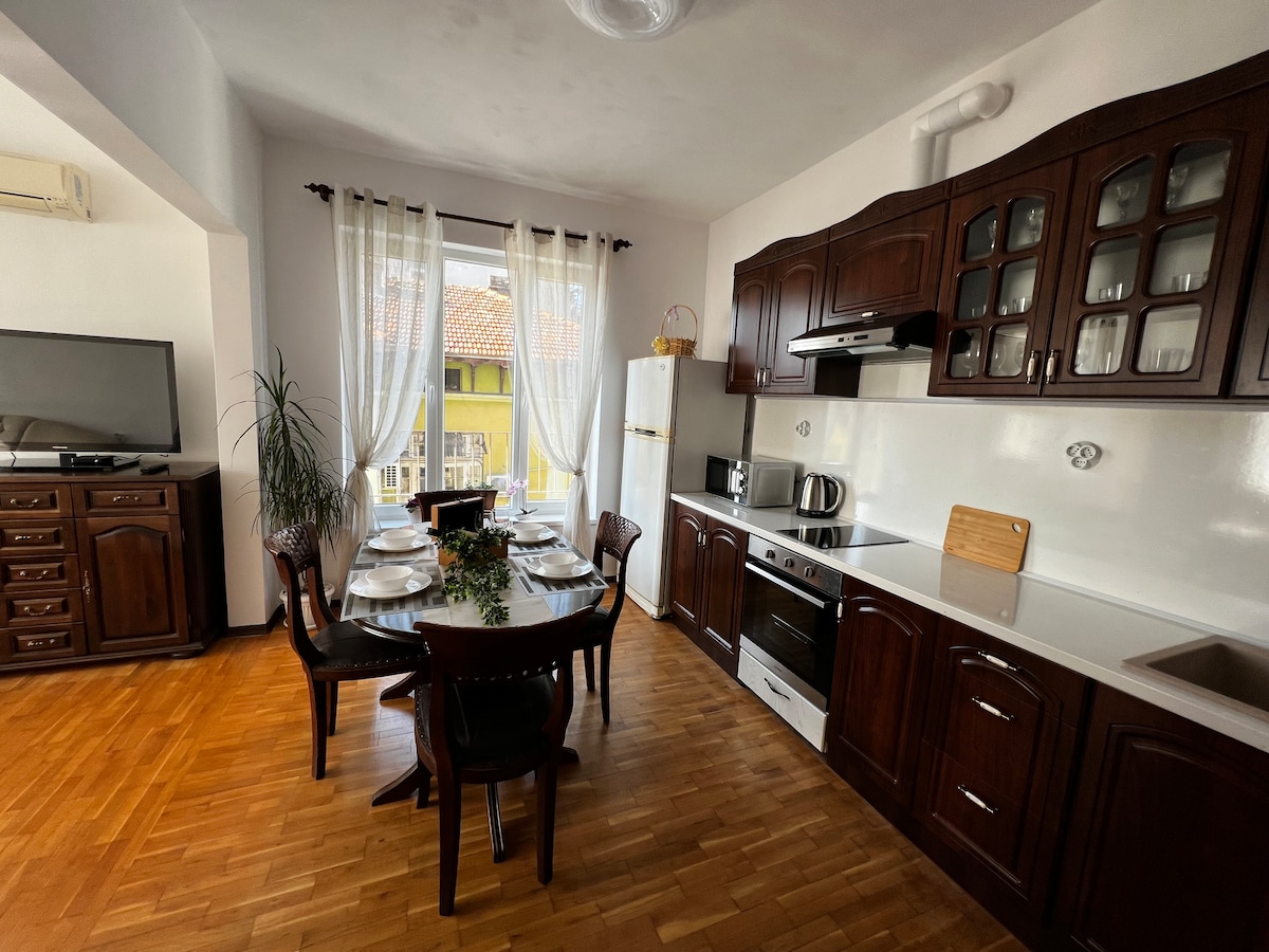Bienvenido a nuestro hermoso y acogedor departamento de 2 dormitorios, ubicado en el centro de la ciudad de Varna. Esta residencia bijou está situada en el centro de la ciudad, con muchos restaurantes, cafeterías, bares y tiendas cerca. Está a solo 5 minutos caminando del famoso jardín marino de Varna, la playa y la zona peatonal. El apartamento tiene capacidad para 4 personas cómodamente (amigos o familiares), tiene aire acondicionado, TV por cable, WiFi rápido gratuito, toallas limpias y ropa de cama limpias, suministro de artículos de tocador. Lee a continuación para obtener más información.