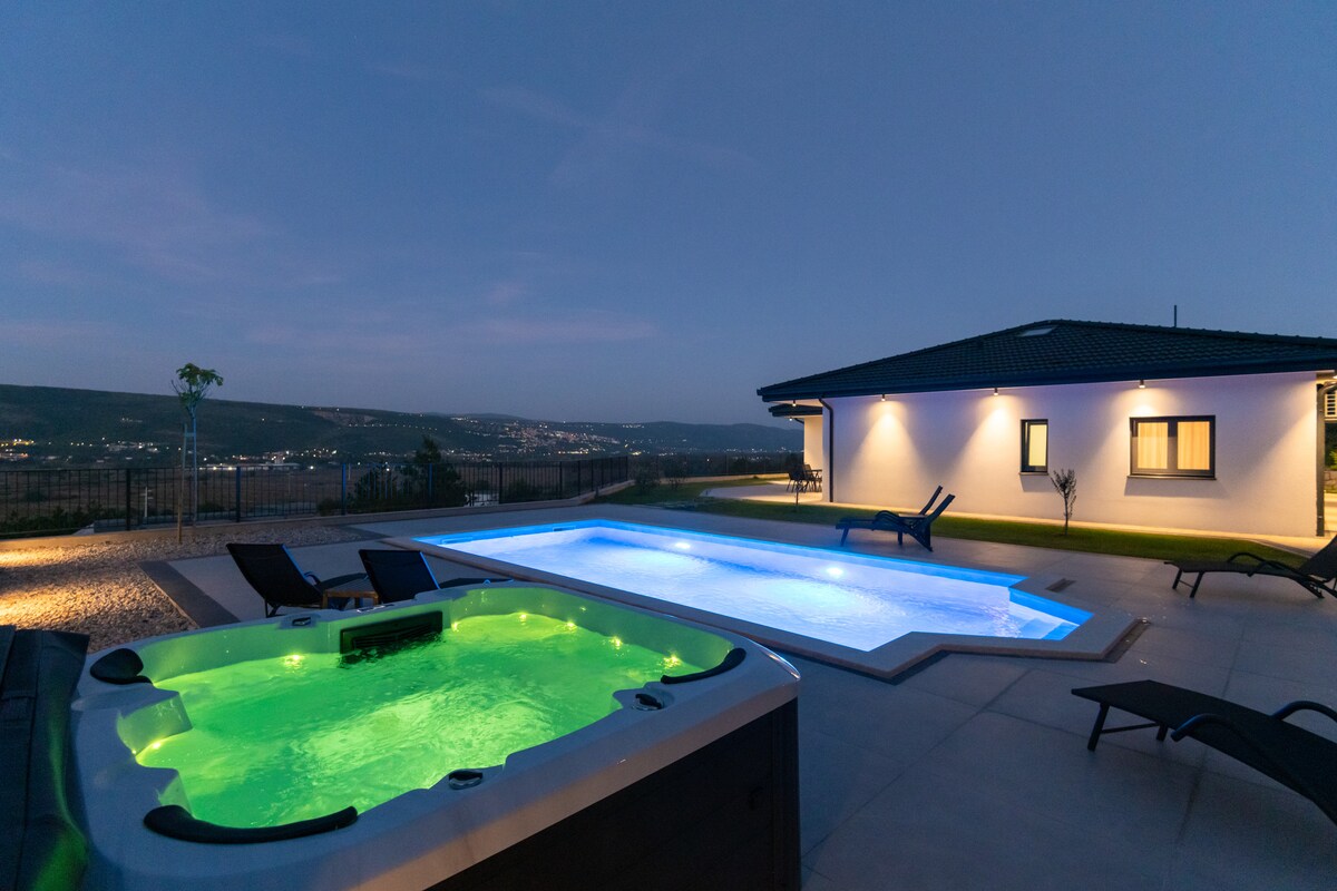 Villa is located in Prolozac 30 km from the sea. Can sleep up to 22 people. Main house offer you four double bedrooms, two bathrooms, kitchen with dining table and living room. Two separate apartment are next door to main house, offer you separate entrance, kitchen, bedroom, bathroom and living room. Brend new house offer you three double bedrooms, two bathrooms, kitchen with dining table and living room. In front of everything you have huge terrace more than 180m2 and lovely pool and hot tub