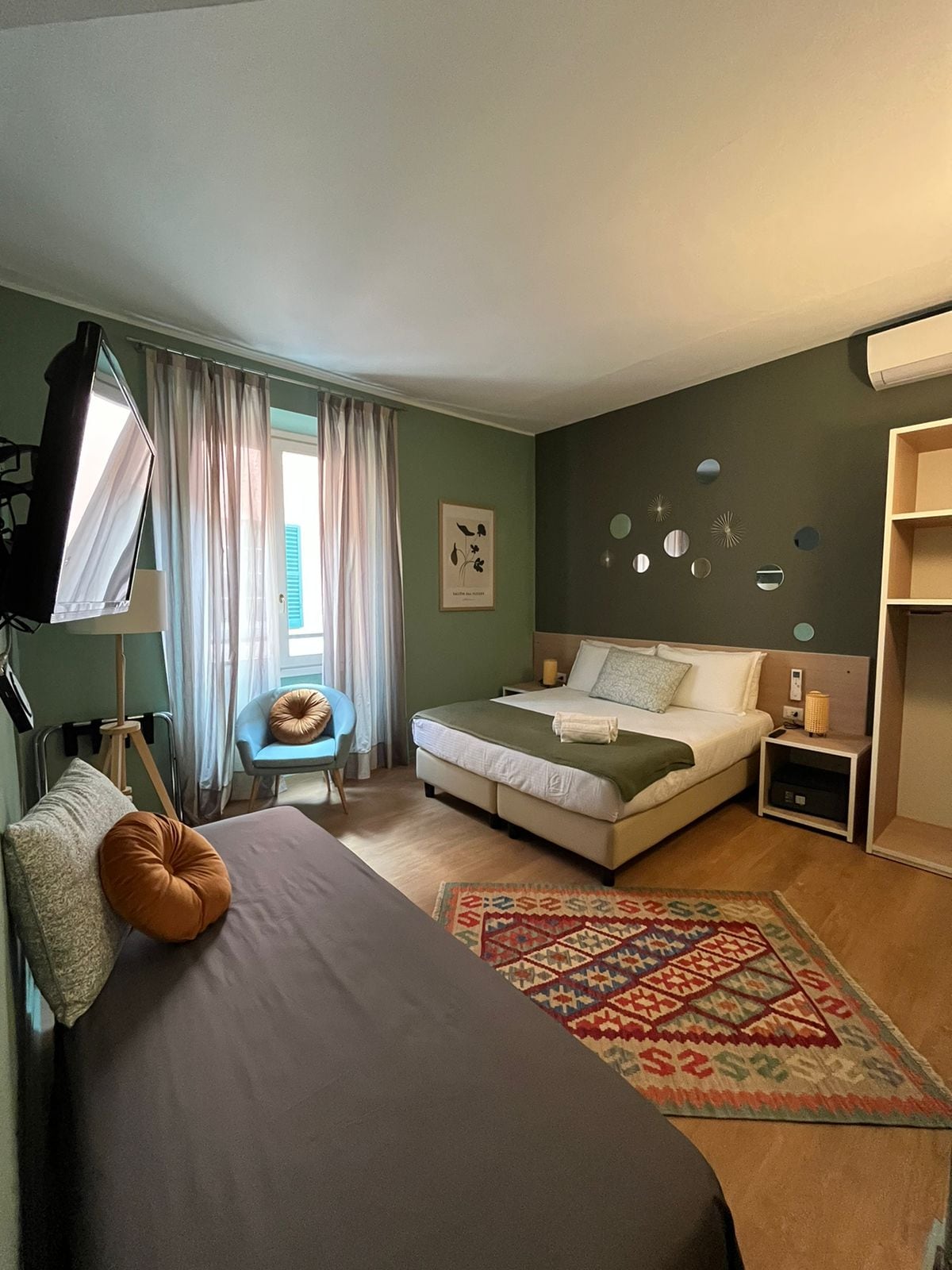 Las habitaciones han sido recientemente renovadas y amuebladas en estilo moderno. Disponen de baño privado con secador de pelo, toallas completas y set de baño (gel de ducha, champú, jabón, etc.). Ofrecemos aire acondicionado, Wi-Fi gratis, TV por cable, ropa de cama y baño completa, nevera, secador de pelo y kit de baño.