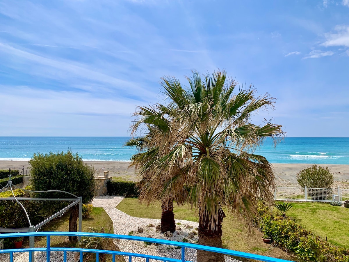 Villa de mar con acceso directo a la playa. A medio camino entre Diamante y Belvedere. Ubicado dentro de un parque privado llamado “Lo Zodiaco”. Dispuesto en 2 niveles: en la planta baja, un baño con lavadora, una cocina y una sala de estar con sofá de TV. Arriba, hay un baño con una gran ducha y 3 dormitorios. En general, tiene capacidad para 7 personas. Zona exterior: gran patio para comer al aire libre con mesa y parrilla, jardín con mecedora/tumbona y escalera para bajar a la playa.