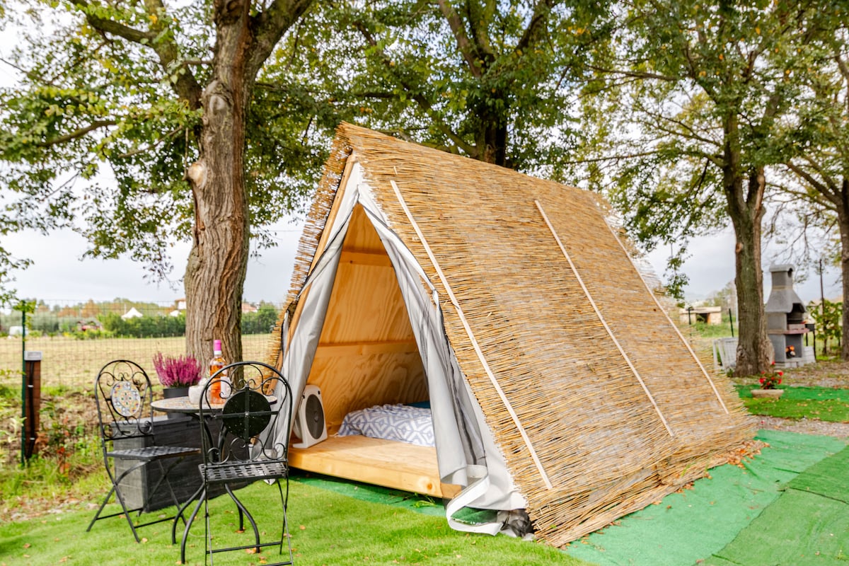 Mini Tienda de Madera Estilo Azteca – Ascea Un refugio romántico y minimalista en el verde del Cilento. Con colchón doble (160×200), colchonetas, almohadas, cubrecolchón, alargador eléctrico, ventilador y antimosquitos. 👉 Trae tu propia ropa de cama y toallas.