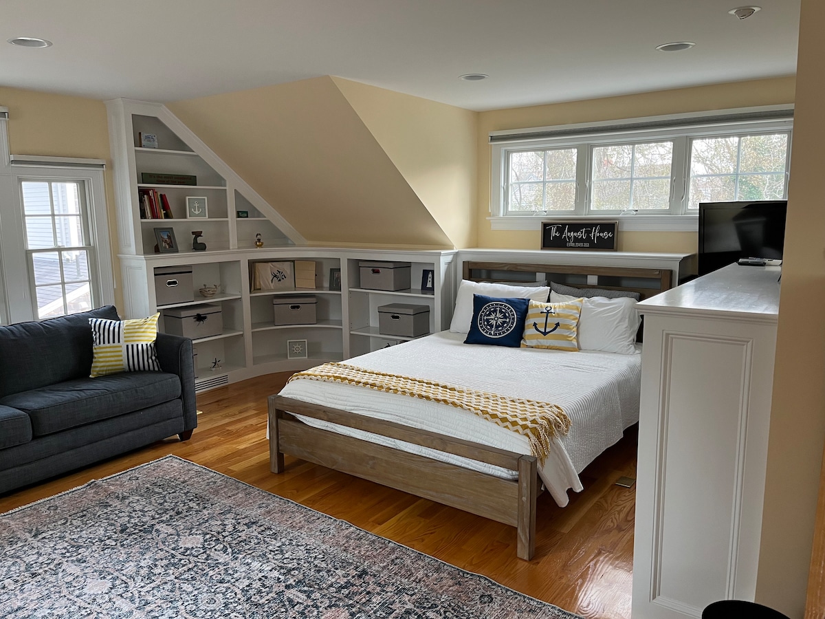 Couple/family fun all year in a charming, private Cape Cod cottage w/ screened in porch, patio & outdoor shower (in Nov/Dec/Jan becomes a Gingerbread cottage). Inside: open living space w/ queen bed & sitting space. Ladder leads to a short height sleeping loft w/ 2 twin beds. Full bathroom w/ indoor shower. Kitchenette- see description below. We supply tea, local coffee, spices, condiments, gas grill, ice chests, beach towels & chairs. To sleep up to 8, also rent our Upper Room on Airbnb.