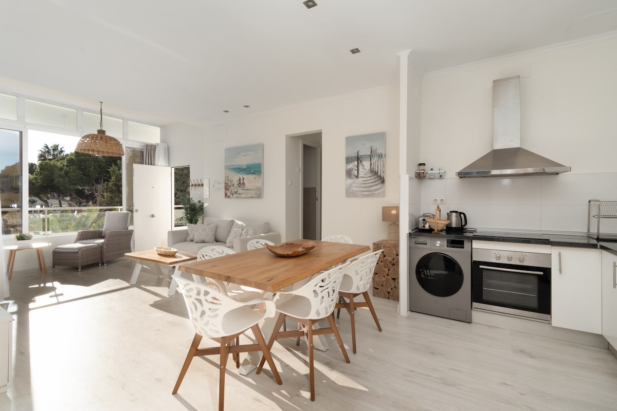 Amplio y encantador apartamento de 2 dormitorios y 2 baños con impresionantes vistas al mar y una maravillosa terraza sobre el mar. Cuenta con acceso directo a la playa, aire acondicionado, WiFi, Apple TV, estacionamiento, jardín y piscina. Totalmente equipado. Las entradas y salidas entre junio y octubre se realizan los sábados. Estancia mínima de 7 noches. Llegadas después de las 24:00 horas tienen un cargo adicional de 50€.