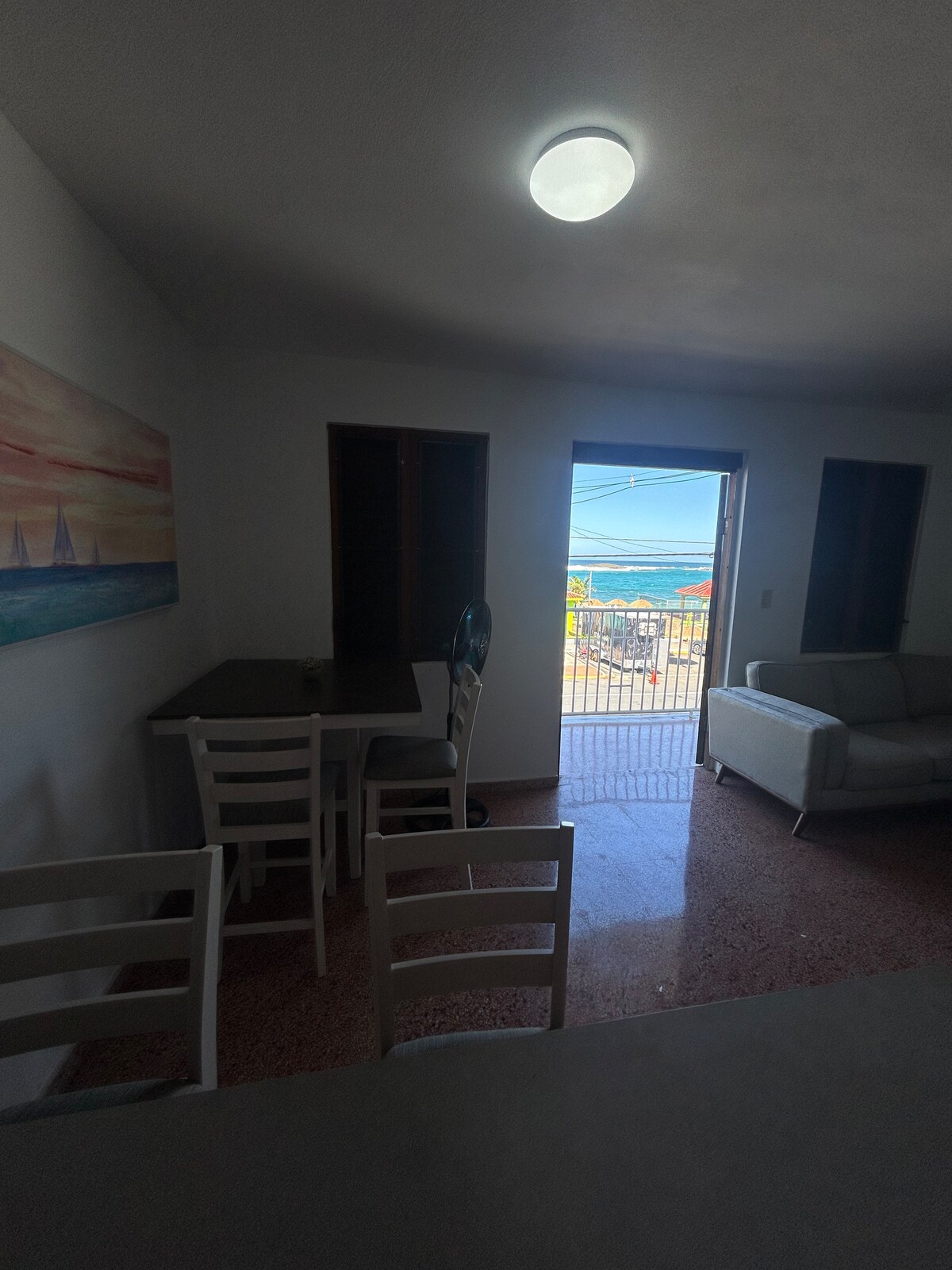 Hermoso penthouse con espectaculares vistas al mar a pocos pasos de la playa. Un dormitorio con una cama tamaño queen y un sofá cama tamaño queen en la sala de estar. Sala de estar, comedor, cocina totalmente equipada, 1 baño, terraza privada frente al mar, estacionamiento privado para 2 autos y sistema de respaldo de energía solar. Cuarto piso @ Mare Blu Building, sin ascensor. Zona turística, cerca de supermercados, restaurantes y tiendas. Te lo pasarás genial en este cómodo lugar y disfrutarás de nuestra hermosa terraza.