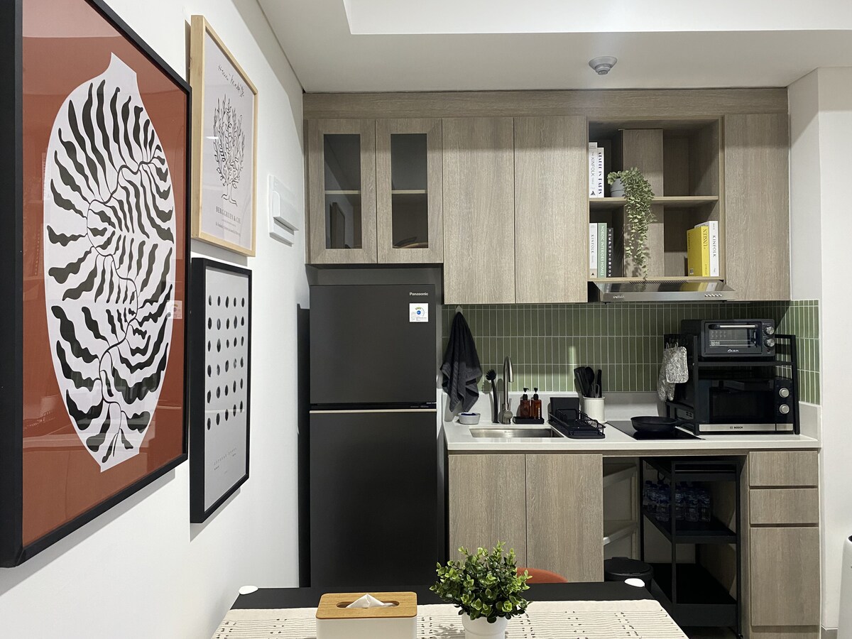 Relájate y desconecta en este alojamiento tranquilo y elegante en el sur de Yakarta, justo al lado de un parque ecológico de 7 hectáreas. Diseño industrial, lujoso apartamento tipo estudio totalmente amueblado: cocina totalmente equipada (estufa, nevera, cafetera Nespresso, todo el equipo de cocina y comedor), TV Android de 43 pulgadas, sofá, cama tamaño queen, baño con ducha caliente. Las instalaciones del edificio incluyen piscina, jacuzzi, gimnasio y plaza de aparcamiento. En el piso 22, tienes una espléndida vista de la ciudad de Yakarta.