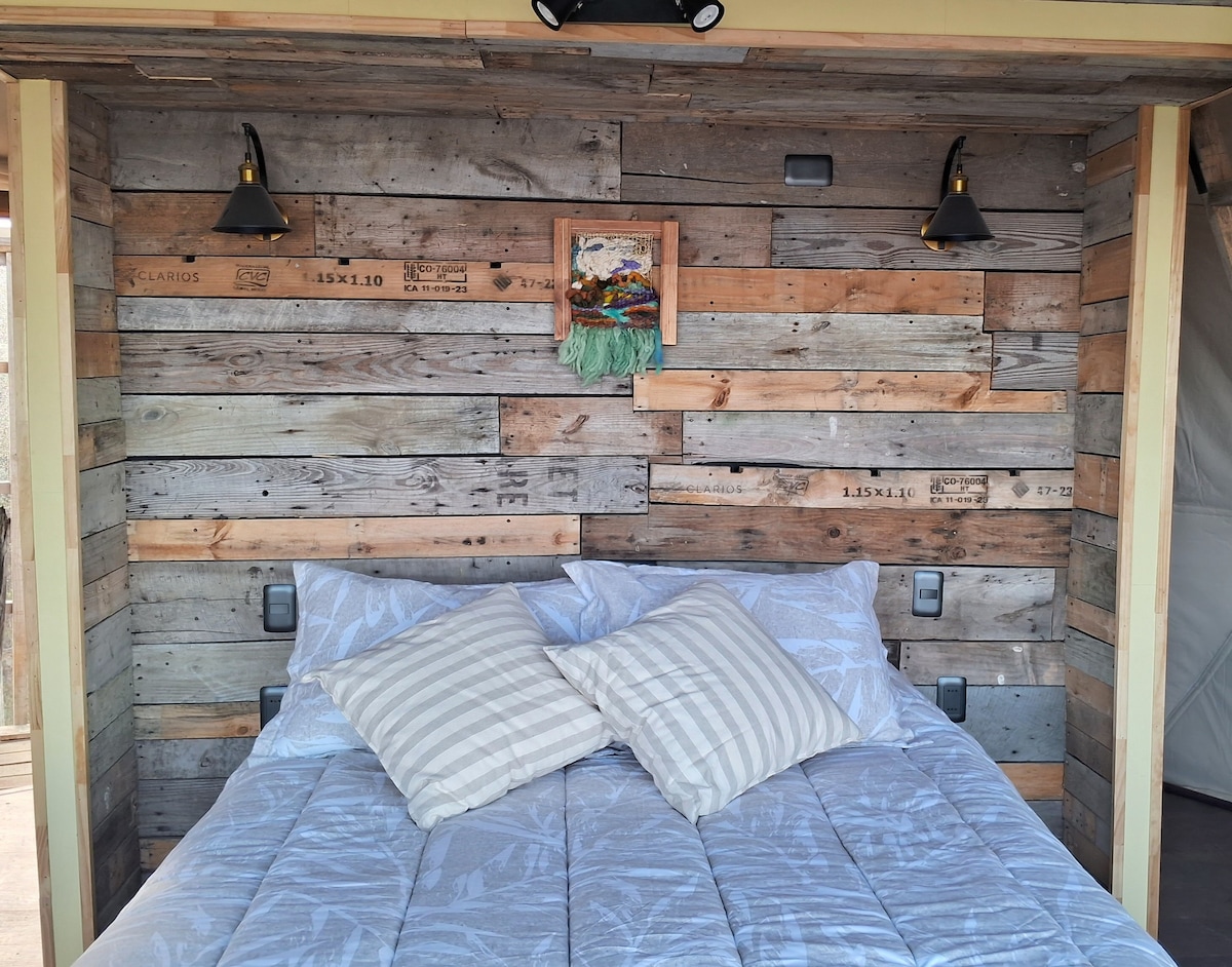 Acogedora cabaña de un dormitorio, perfecta para parejas o viajeros que buscan tranquilidad y descanso. Cuenta con una cómoda cama de plaza y media, un espacio cálido para relajarte y disfrutar de momentos de paz. Rodeada de naturaleza, pero con fácil acceso a servicios y puntos de interés. Ideal para desconectar y recargar energías en un entorno sereno. ¡Tu refugio te espera!