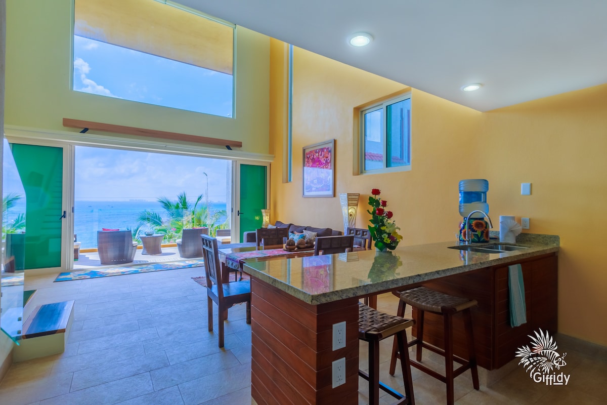 ¡Vistas únicas a la playa más popular de Cancún desde cada habitación de este ático! ¡Nunca olvidarás los momentos que pasas en el balcón envolvente contemplando el océano y disfrutando de la brisa! ¡Despiértate rodeado de agua turquesa, arena blanca y la impresionante vista a la playa durante 20 millas! Disfruta de tu café o coctel desde la punta de la península de Yucatán, donde el tiempo se detiene. Sal del vestíbulo y sal a la arena O camina 1 minuto a más de 20 restaurantes, bares y vida nocturna.