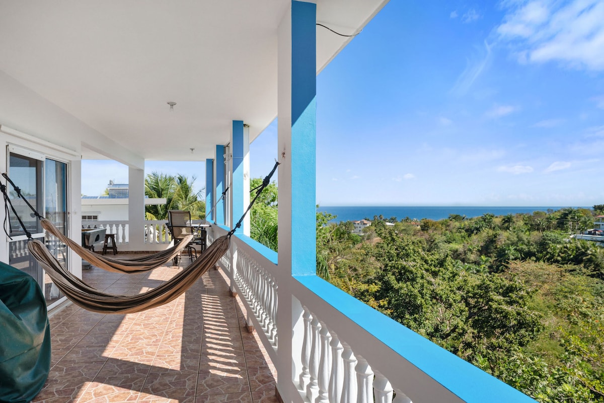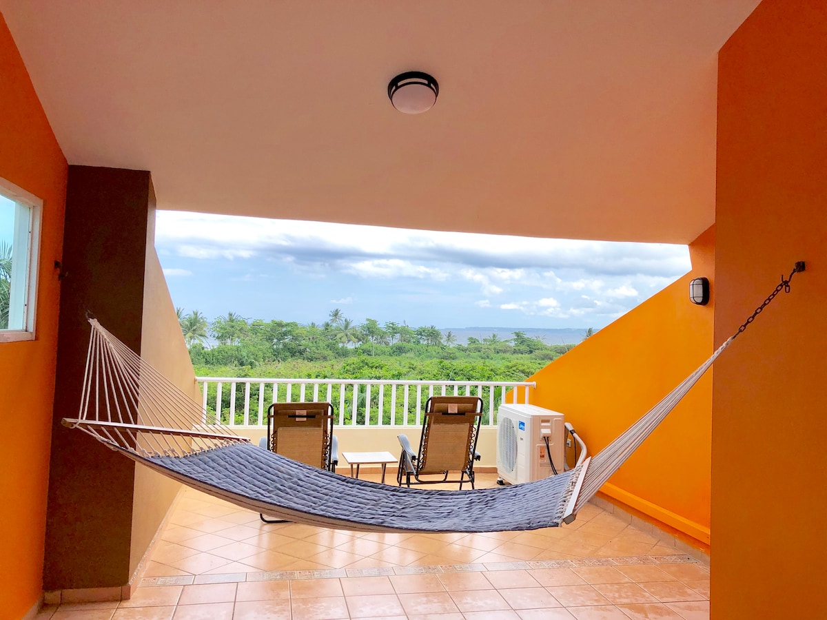 ¡Disfruta de un fácil acceso a todo! Desde este apartamento perfectamente ubicado, ¡para TODAS las cosas de Rincón! Ubicado en la 413-"Carretera a la felicidad". ¡Playas, restaurantes, muchos a poca distancia a pie! Piscina (compartida con el apartamento inferior)... Vistas al mar desde el balcón. 2 dormitorios: 1 cama tamaño king, 1 cama tamaño queen. Los dormitorios y la sala de estar tienen aire acondicionado. ¡La casa es nueva y totalmente alimentada con energía solar!