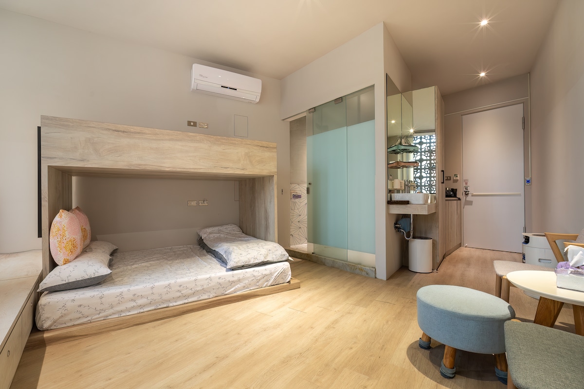 Step into this cozy studio—perfect for solo travelers or couples. Designed for comfort, featuring a plush queen bed, a compact kitchenette and a relaxing seating area in a quiet neighborhood just minutes away from convenience stores and local eateries. 📍Prime Location • 2-min walk to Danhai LRT 淡海輕軌 Ganzhenlin 竿蓁林站 → Just 1 stop to Hongshulin MRT 紅樹林站 • 7-min walk to MRT Tamsui-Xinyi Line 淡水-信義線 Hongshulin Station → Direct to Taipei 101 (~45 mins) • 1 MRT stop to Tamsui Old Street 淡水老街
