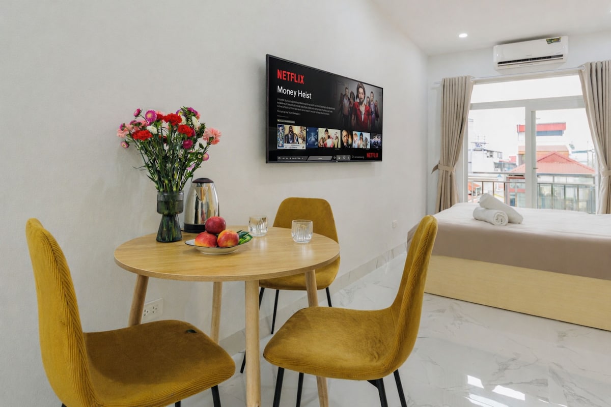 Un moderno departamento con servicios incluidos en Dao Tan, Ba Dinh, a pocos pasos del Lotte Center Hanoi y un animado comedor japonés lleno de restaurantes, cafeterías y comidas locales. Cerca de Thu Le Park para una escapada verde. Ideal para estancias cortas o largas, ofrece una cama suave, un espacio luminoso, un televisor inteligente (Netflix, YouTube), wifi rápido y una cocina pequeña básica, cómoda, privada y conveniente en uno de los barrios más habitables de Hanói.